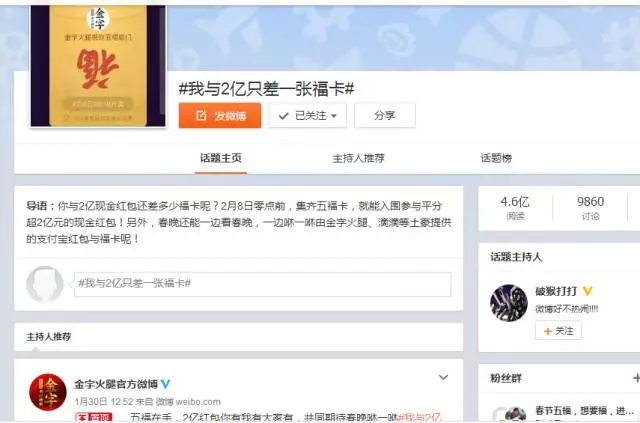 自前幾天支付寶將“集5福,搶2億+紅包”的活動(dòng)規(guī)則公布后,一時(shí)間,有關(guān)??〒Q贈(zèng)的話題強(qiáng)行霸屏。在有金字粉絲集齊了五福后,金字順勢(shì)在微博平臺(tái)上策劃的#我與2億只差一張???的微話題就引發(fā)了高達(dá)4.6億的閱讀量,網(wǎng)友們通過(guò)點(diǎn)贊評(píng)論及轉(zhuǎn)發(fā)分享的方式,第一時(shí)間表達(dá)了自己對(duì)于五福??ê痛和?億紅包的高度期待!