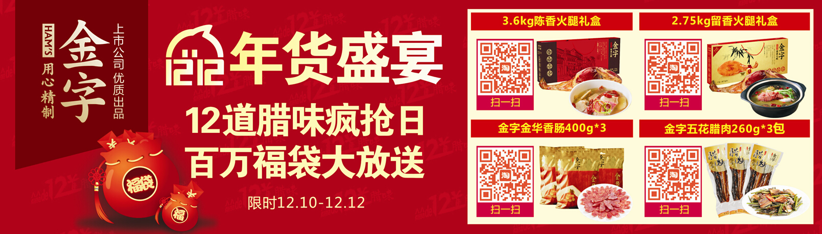 2015呼之欲來(lái),在2014的年末,金字火腿以“12道臘味”致敬你過(guò)去1年的辛勞。12月12日,在金字火腿天貓旗艦店,最經(jīng)典的12款寶貝價(jià)格最低2折起,滿318元就送百元福袋(內(nèi)含2包45g肉棗、2包40g火腿片、1張肉票、1份利是封),還可參加抽大獎(jiǎng)活動(dòng),屆時(shí)將會(huì)抽取2名價(jià)值不菲的巴瑪火腿大獎(jiǎng)和24名價(jià)值500元的12道臘味大獎(jiǎng)。